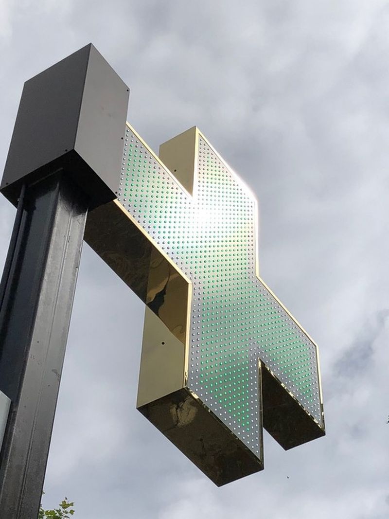 Pour la Croix de pharmacie sur mât, le principes est le même que les lettres boitier, le chant est en laiton.