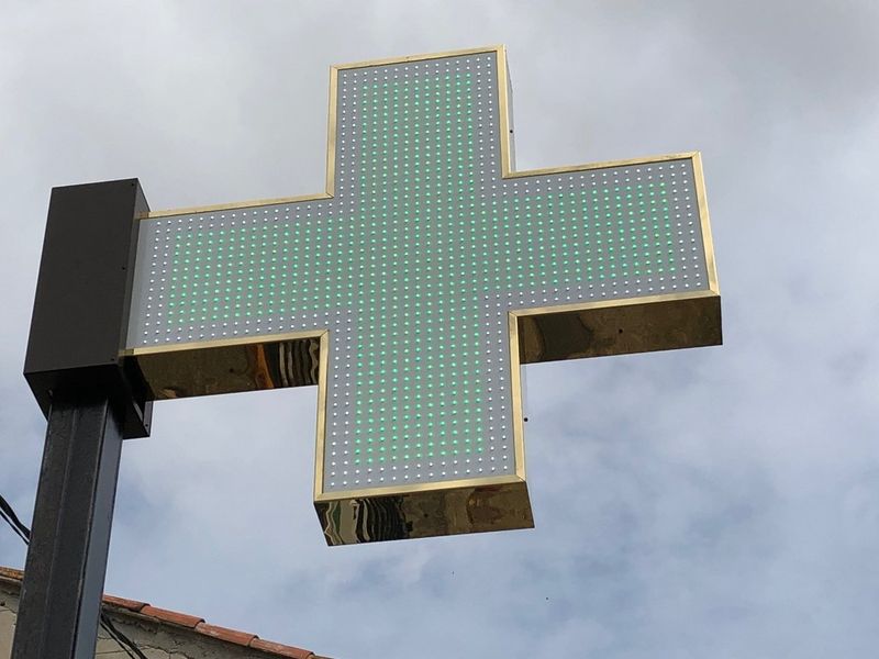 Le texte PHARMACIE en lettres boitier plexiglas, les faces en plexiglas blanc diffusant et chant en laiton 10/10.
