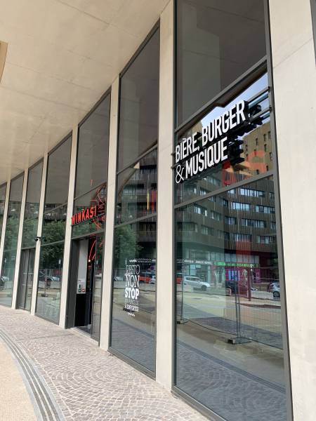 Nous avons collaboré avec eux pour la conception et la réalisation de divers éléments, notamment plusieurs enseignes, éléments adhésifs, affiches et dessins en néon. Les enseignes intérieures et extérieures ont été conçues en lettres boîtiers lumineuses, avec des chants en aluminium et des faces en plexiglas. En complément, nous avons mis en place de la vitrophanie en film adhésif, intégrant également des éléments en film dépoli pour un effet distinctif. Les affiches ont été imprimées sur du papier type "manifesto", idéal pour un collage similaire à celui des affiches de concerts. Enfin, nous avons enrichi leur environnement visuel avec plusieurs dessins en néon rouge, ajoutant une touche distinctive et lumineuse à leur espace.