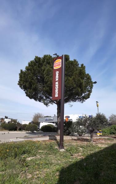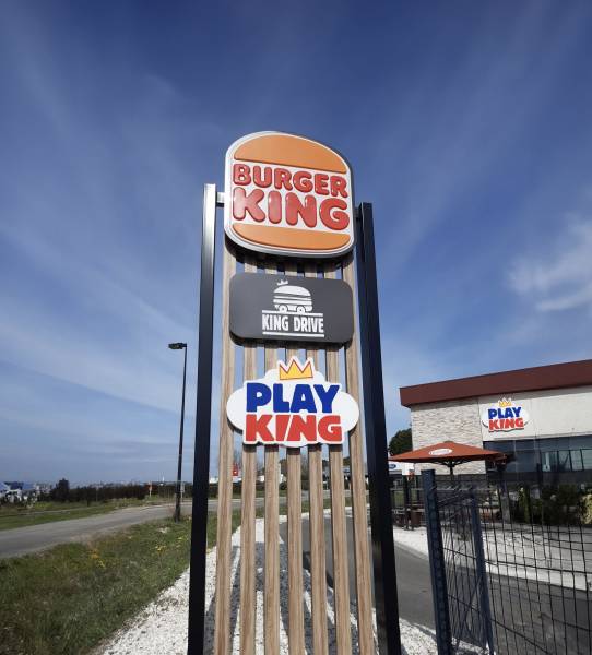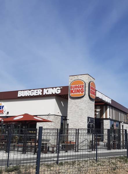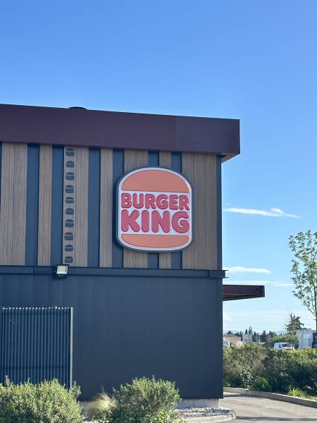 Nous avons dû changer tous les logos, ainsi que des adhésifs, des fresques et également des éléments sur les bornes. Les logos lumineux sont fabriqués à partir de faces en plexiglas blanc diffusant avec des bordures en aluminium. Ensuite, à l'aide de film adhésif, nous avons apposé le célèbre logo Burger King. Le plus gros logo, lui aussi lumineux, se distingue par l'utilisation de plexiglas thermoformé. Pour l'éclairage, ils bénéficient tous du même système : une lumière intérieure équipée de diodes "blanc chaud". Pour l'intérieur du restaurant, nous avons réalisé une fresque en impression numérique, installée sur des panneaux en alumatelbond. En ce qui concerne les bornes, elles ont été recouvertes d'un mélange d'impression numérique et de film adhésif. Enfin, nous avons remplacé les anciens adhésifs par de nouveaux portant le nouveau logo.