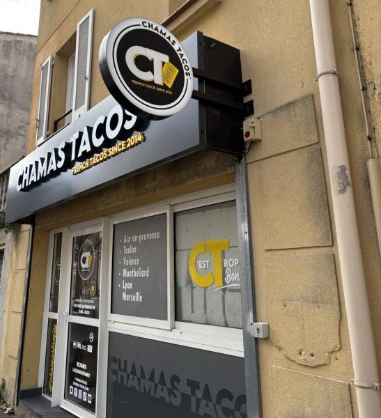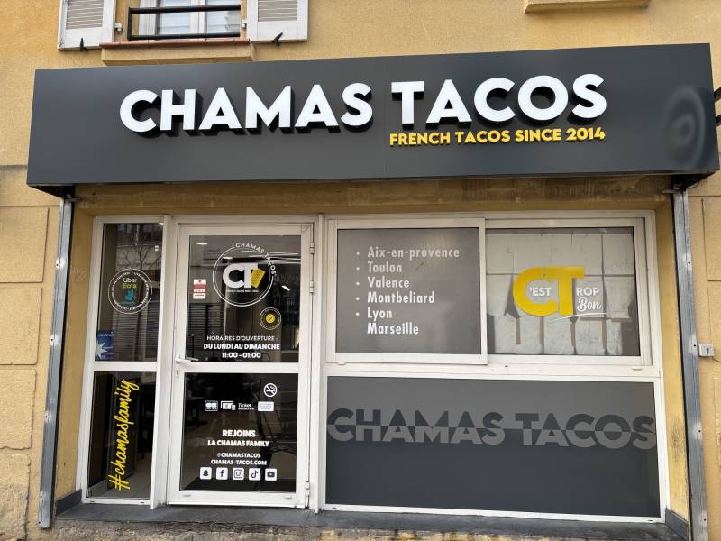 Nous avons aussi conçu deux enseignes pour les façades, côté boulevard et côté parking. Elles ont été fabriquées sur tôle tablette, avec le texte "CHAMAS TACOS" en lettres boitier, la face est en plexiglas blanc diffusant avec un relief en aluminium laqué et un éclairage intérieur par diodes blanches. Pour "FRENCH TACOS SINCE 2014", le texte à été réalisé en lettres PVC compact découpées a plat et laquées.