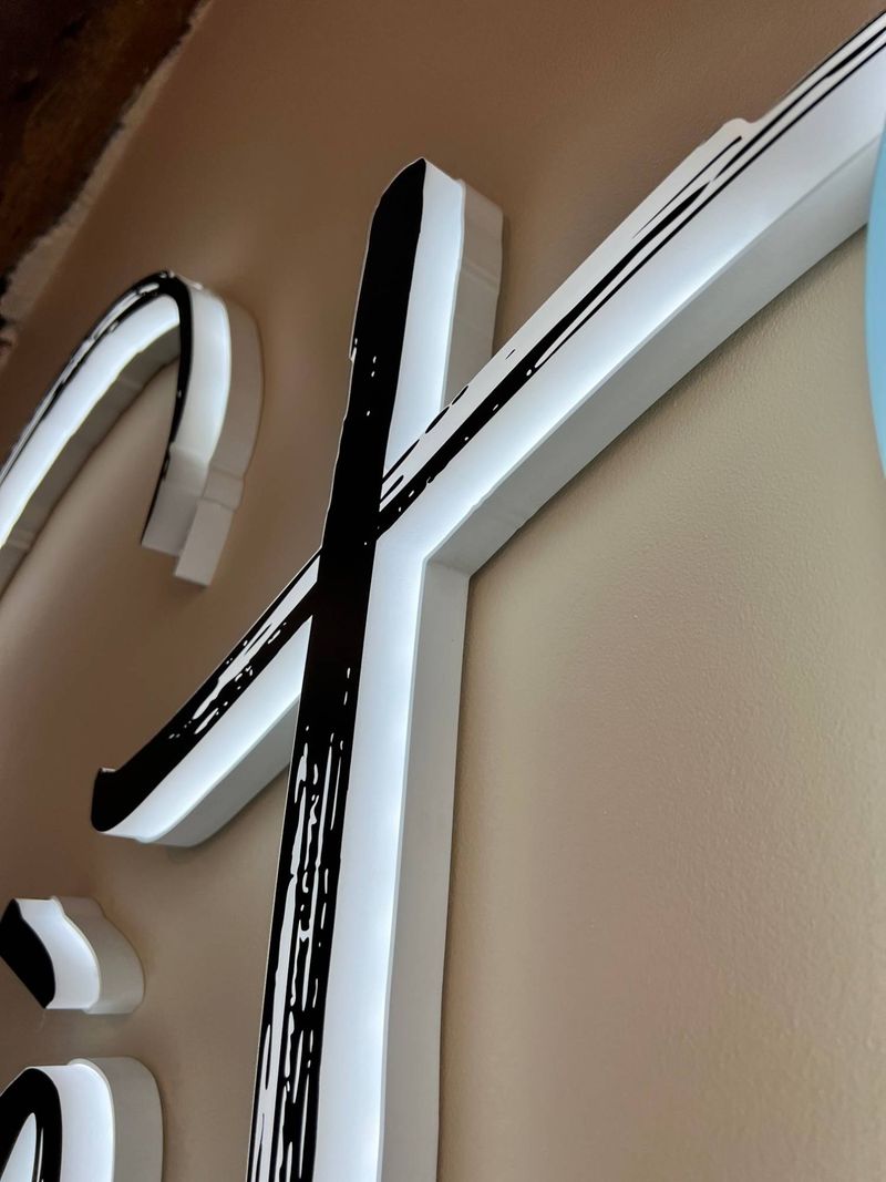 La superposition des 2 matières plexiglas diffusant 30 mm "bloc led" et PVC compact, permet un déport des lettres et crée un halo de lumière.