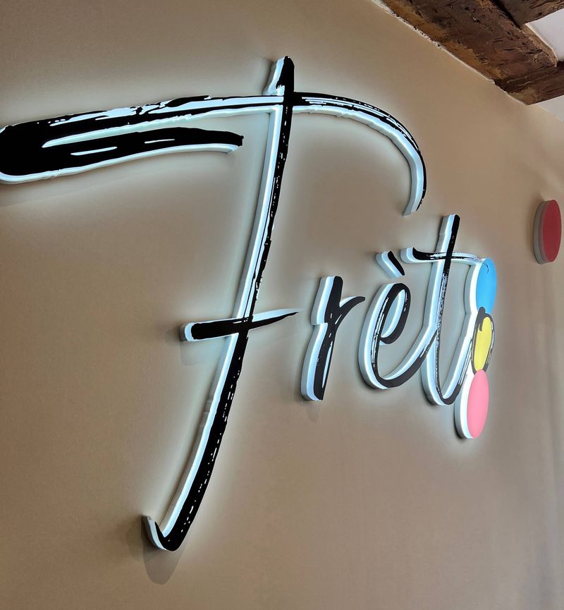 Pour la fameuse équipe de la Maison Frèto nous avons réalisé un logo intérieur en plexiglas bloc led sur semelles en PVC compact.