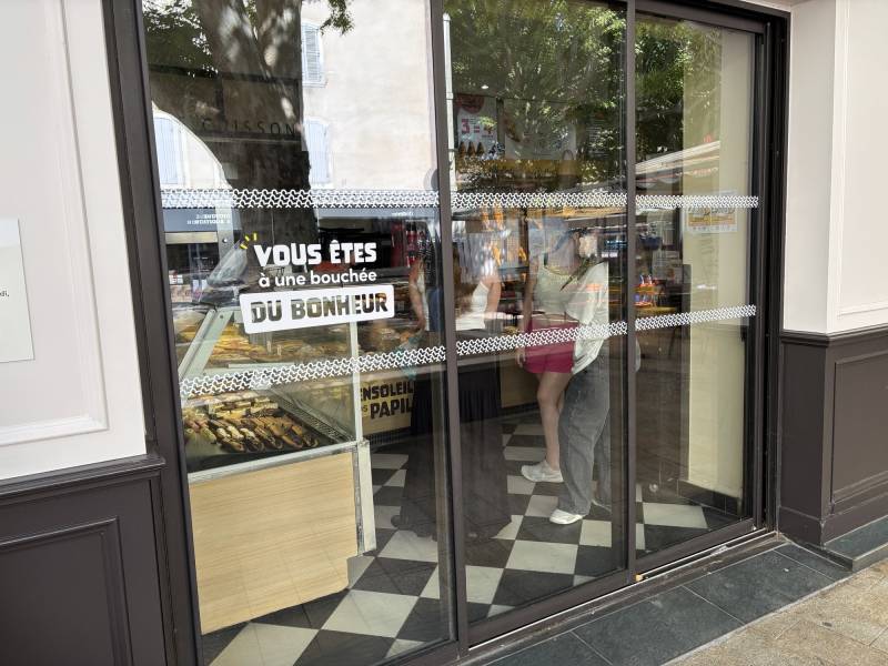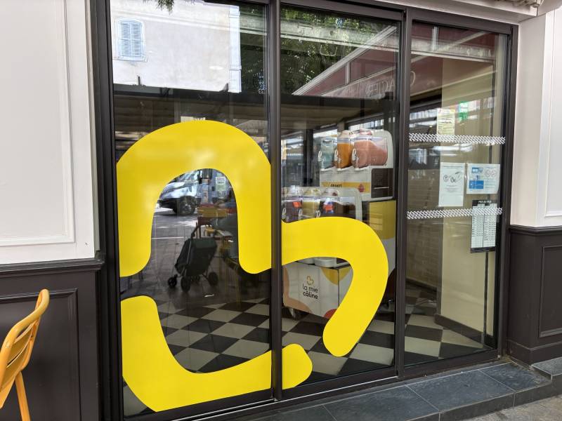 Pour renforcer l’identité visuelle, un logo en vitrophanie a été créé en film adhésif teinté dans la masse de couleur jaune, garantissant une pose esthétique et une excellente tenue dans le temps. Et, un lettrage « Bonheur » a été appliqué en film adhésif standard teinté dans la masse, apportant la touche finale à cette signalétique complète.