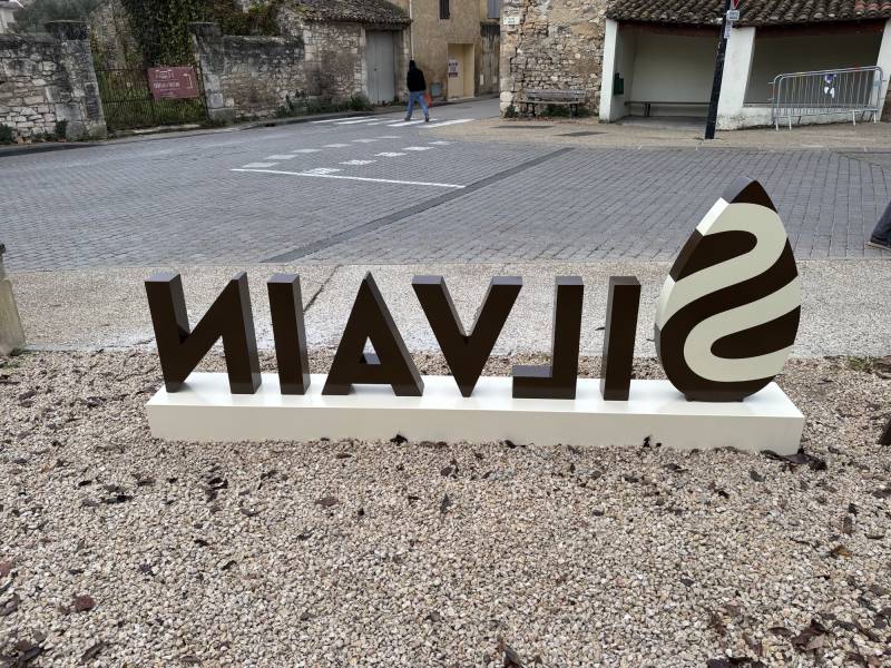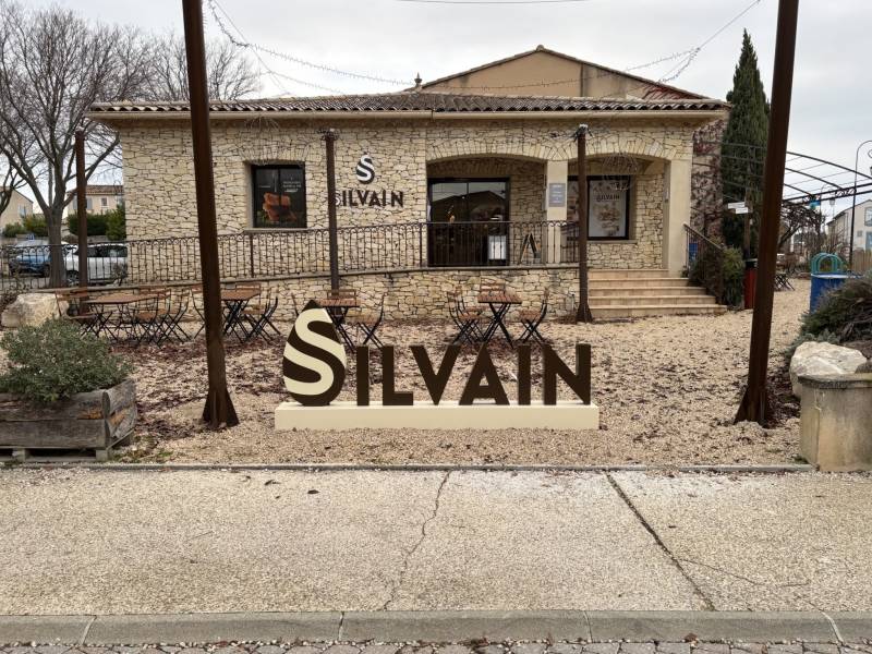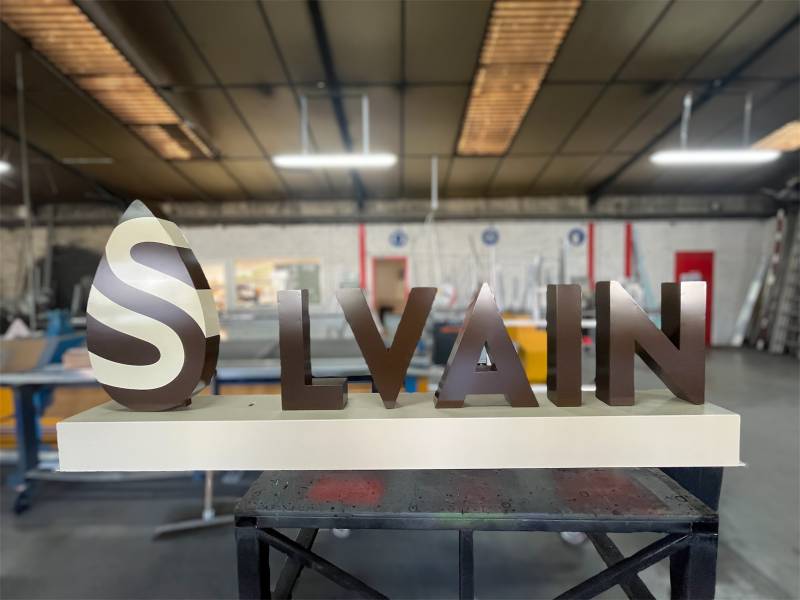 Pour ce projet, nous avons conçu et fabriqué une enseigne avec un châssis intégré, composée de lettres boitier représentant "Silvain" et leur logo. Les faces, reliefs et fonds ont été réalisés en alu laqué, avec l'ajout d'un adhésif teinté masse beige pour le logo en forme d'amande. Chaque lettre est renforcée par un châssis interne en tube alu, l'ensemble est fixé sur un socle en tôle alu laqué.