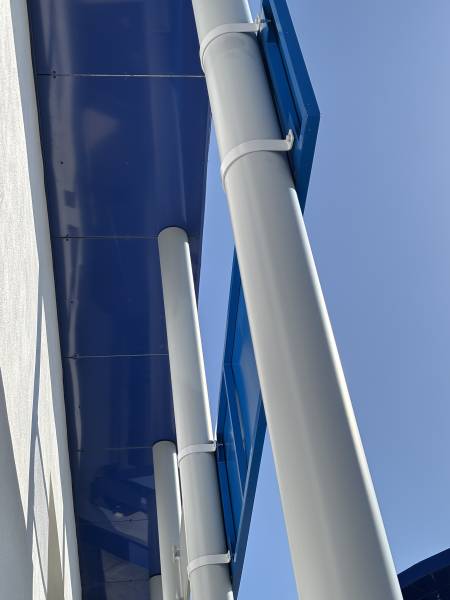 Pour la pose des enseignes de Valiance Fayat, notre équipe a dû adapter ses méthodes habituelles. À la demande du client, aucun perçage n’était autorisé pour les supports d’enseignes. Notre bureau d'études a du adapter la fabrication des enseignes en fonction des supports déjà existant, afin que nos poseurs les utilisent : des cornières de fixation ont été installées sur les platines, et des colliers de serrage avec une mousse de protection afin de préserver le laquage des poteaux.
