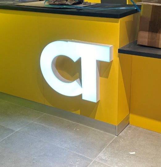 Pour le comptoir, nous avons réalisé un logo "CT" en boitier plexiglas blanc diffusant avec relief en alu laqué, semelle en PVC et un éclairage par diode blanche.