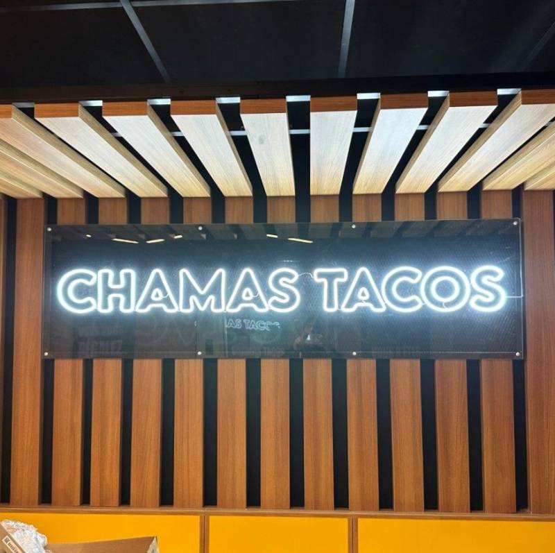 Pour leur 100ᵉ restaurant, Chamas Tacos, nous a demandé une enseigne "CHAMAS TACOS", en boitier et aluminium avec faces pleines blanches, un relief en alu laqué et une semelle en plexiglas blanc diffusant avec un éclairage indirect par diode blanche. Le lettrage "FRENCH TACOS SINCE 2014" est en PVC compact découpé à plat laqué.