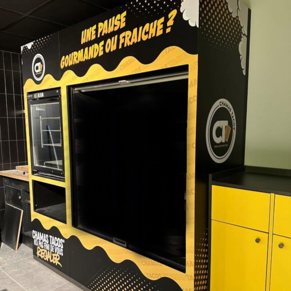 Nous avons aussi créé des décorations murales avec "CHAMAS TACOS" en tube LED blanc fixé sur un panneau en plexiglas incolore, "LE VRAI GOÛT DU FRENCH TACOS" en matelbond et "TACOS" en tube LED jaune fixé panneau en plexiglas incolore. D'autres décorations ont été posées en matelbond avec application d'un film adhésif et impression numérique anti UV.