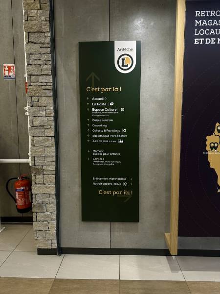 Concernant la signalétique directionnelle, nous avons produit des totems muraux, des enseignes drapeaux, des plaques signalétiques et divers panneaux.