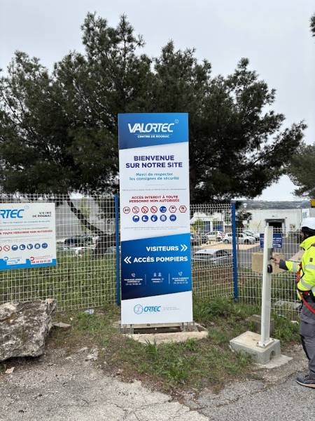 Nous avons également réalisé la rénovation d'un totem déjà existant et un nouveau totem pour les bureaux de Valortec. Pour la rénovation, nous avons procédé à l'habillage du totem existant avec deux tôles en aluminium prélaqué blanc, pliées, et un décor en adhésif avec impression numérique et protection anti-UV.