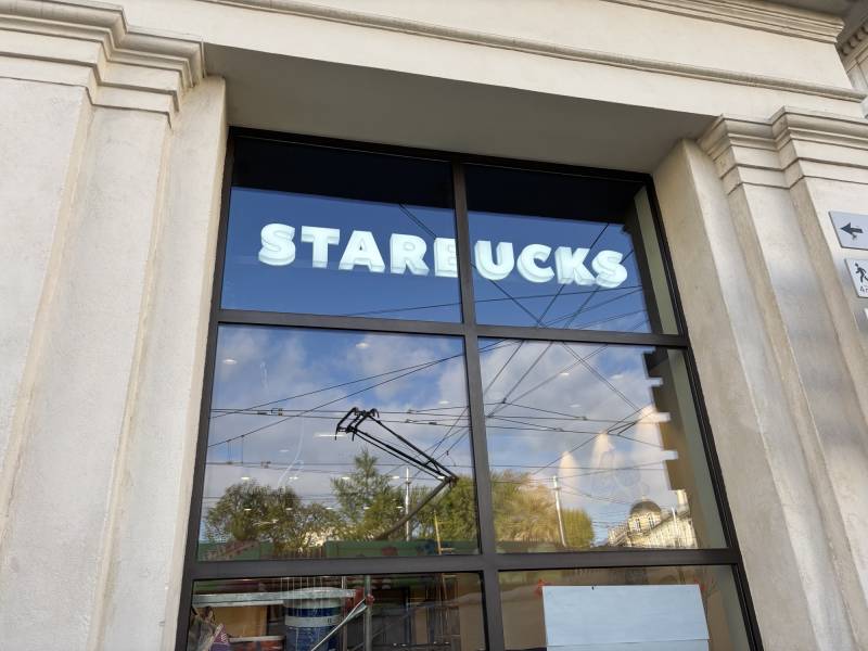 Pour le projet Starbucks à Montpellier, nous avons conçu et fabriqué plusieurs enseignes sur-mesure, dont une enseigne lumineuse avec le lettrage "STARBUCKS" en plexiglas blanc diffusant, monté sur un fond en PVC noir et éclairé par des diodes blanches. La fixation se fait sur une structure en tube et U alu de section.