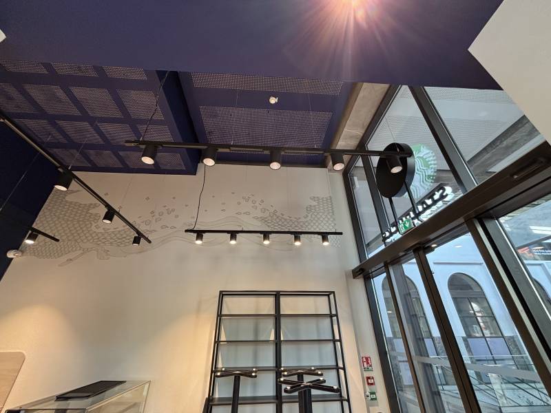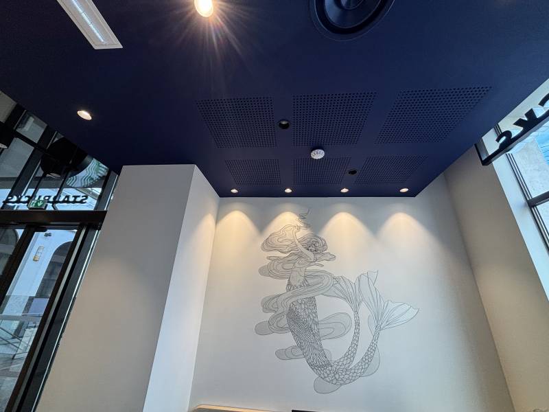 Nous avons également installé des visuels muraux en impression numérique sur film incolore avec plastification mate, représentant des vagues et la célèbre sirène emblématique de Starbucks.