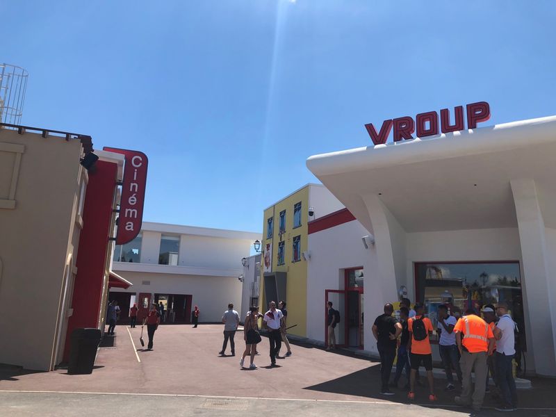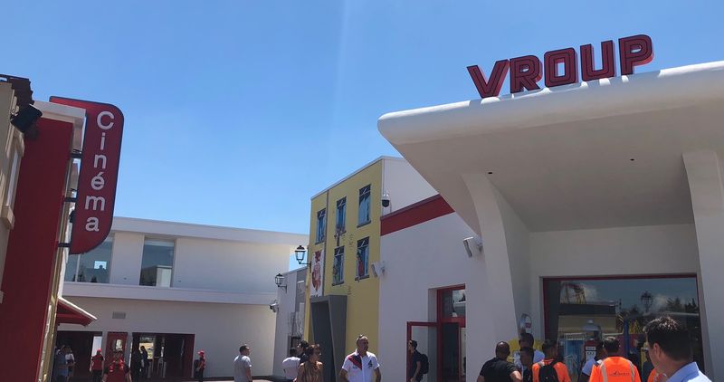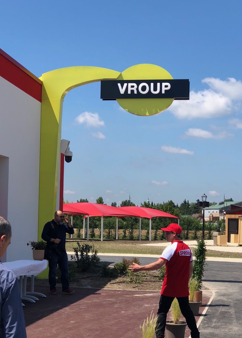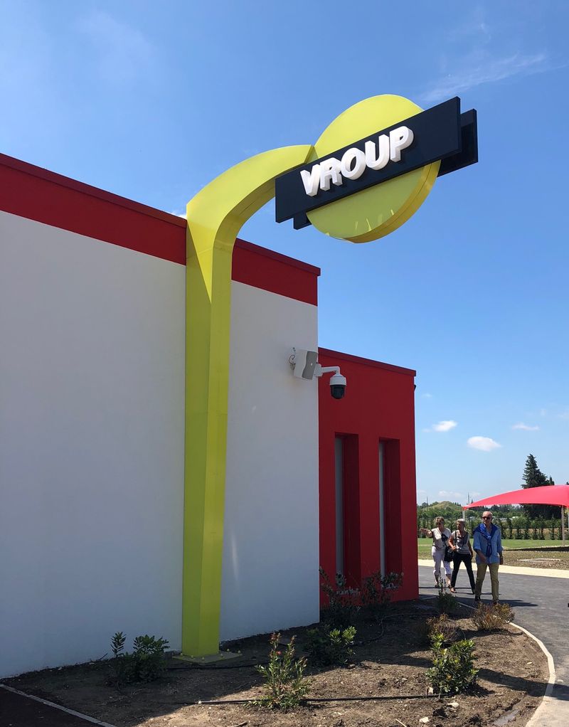 Nous avons également contribué à quelques éléments qui se trouvent dans le parc, tels que le portique lumineux VROUP. Il s'agit d'une structure en aluminium avec une tôle tablette, comportant des lettres boîtier en plexiglas.