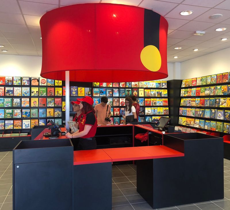 Un calot de Spirou sert de décoration dans une boutique, fixé sur une structure métallique avec un décor en impression numérique sur textile.