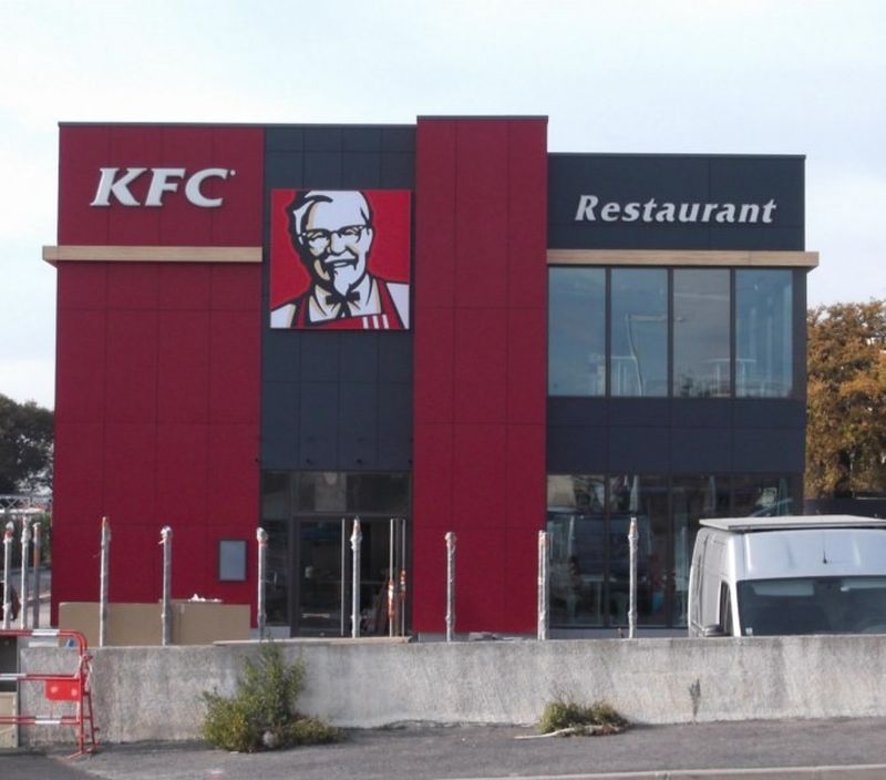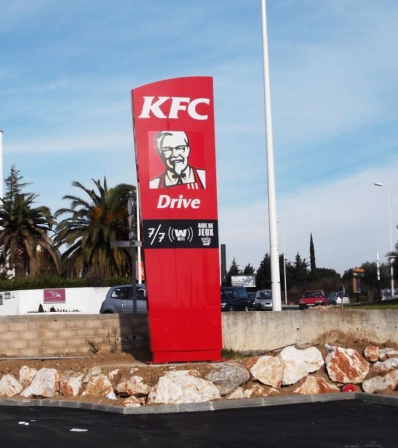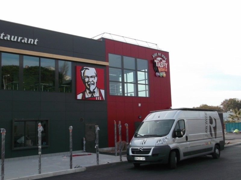 KFC a sollicité nos services pour la création de divers éléments sur le site de Perpignan. Nous avons développé des enseignes lumineuses en plexiglas thermoformé, mettant en valeur le logo avec une toile tendue rétroéclairée. Cette approche apporte texture et dimension à l'enseigne.