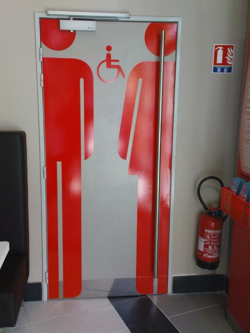 Les vitrophanies intérieures et extérieures, notamment les aires de jeux pour enfants. Certaines vitrophanies sont contre collées sur des panneaux en alu matel bond de 3 mm.
