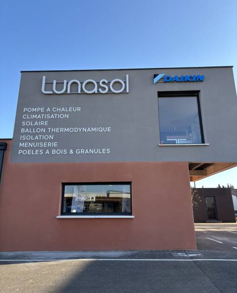 Nous avons fabriqué quatre enseignes lumineuses, deux "LUNASOL" et deux "DAIKIN", en lettres boîtiers. Les enseignes "LUNASOL" sont conçues avec des faces en plexiglas blanc diffusant, des chants en aluminium laqué blanc et un fond en PVC. Celles de "DAIKIN" suivent le même principe, avec des faces en plexiglas blanc et bleu diffusant, des chants en aluminium laqué bleu et blanc et le fond en PVC, avec un film adhésif teinté bleu appliqué sur la face du logo. Toutes les enseignes ont été fixées sur des lisses en tube alu laqué. Pour finir avec les enseignes, nous avons également travaillé sur une enseigne intérieure lumineuse "LUNASOL", le lettrage a été découpé en PVC compact pré laqué blanc et l'éclairage indirect des lettres par des diodes de couleur blanche.