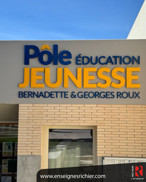 Pour le Pôle Éducation Jeunesse, le lettrage a été réalisé également avec des lettres boitiers en aluminium et fond PVC, l’enseigne a été laqué de couleurs bleu et jaune.