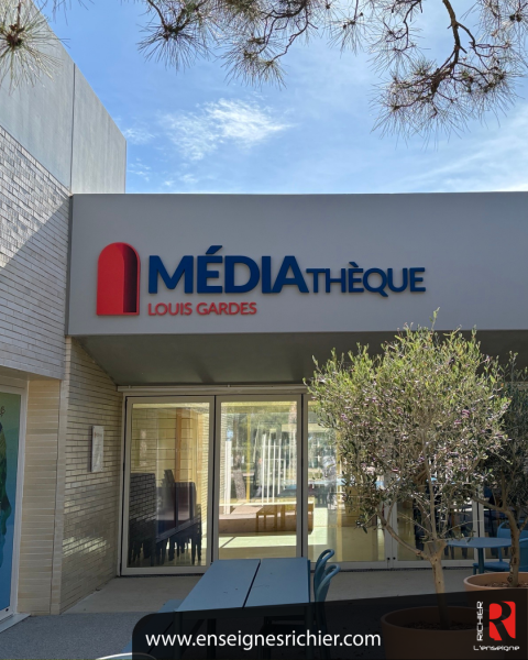 À la Médiathèque Louis Gardes, nous avons conçu et fabriqué des lettres reliefs en aluminium et fond PVC, intégrant le logo du bâtiment, le lettrage a été laqué bleu et rouge.