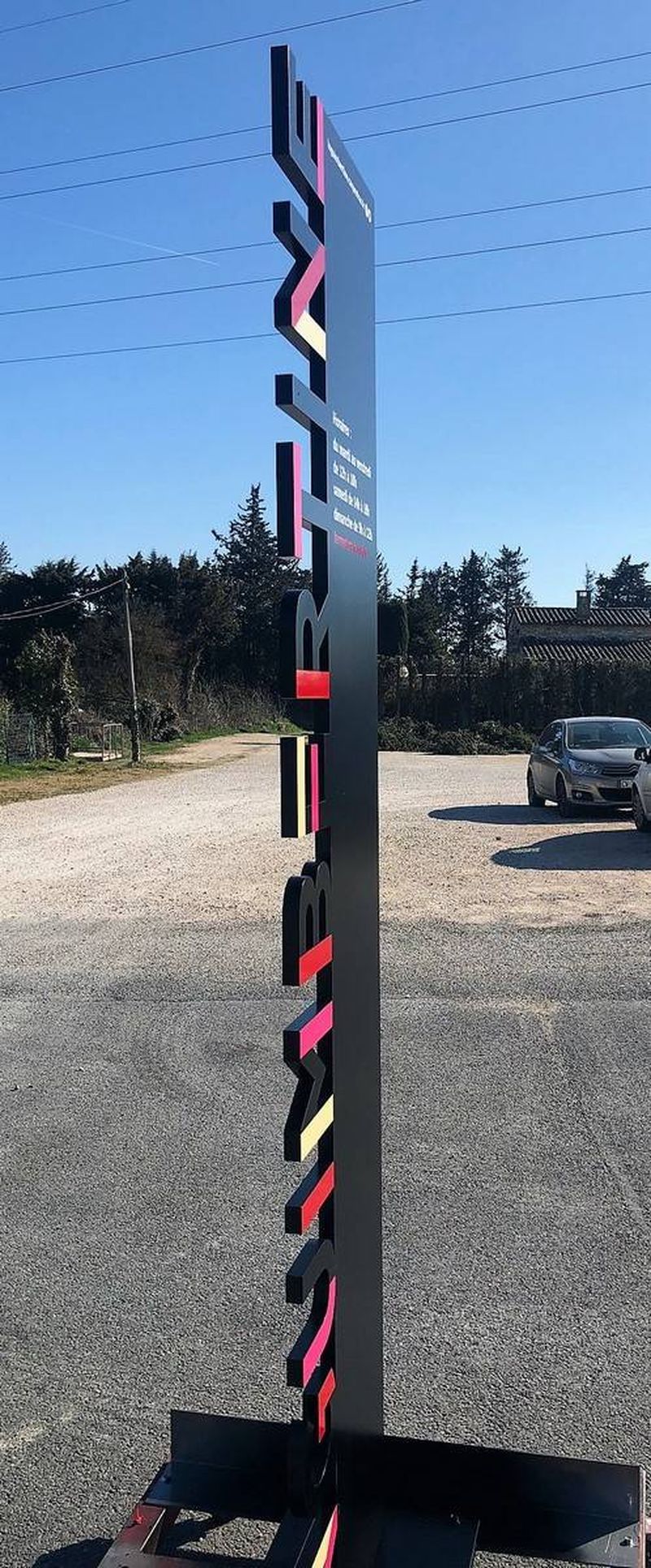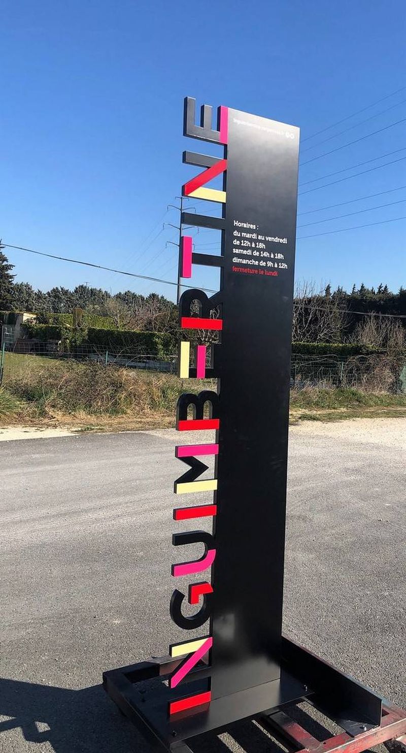 Pour enrichir la signalisation de la bibliothèque INGUIMBERTINE à Carpentras, nous avons conçu un totem à une face. Ce totem extra-plat est fabriqué en aluminium 20/10, revêtu des teintes définies par la charte graphique de l'institution.