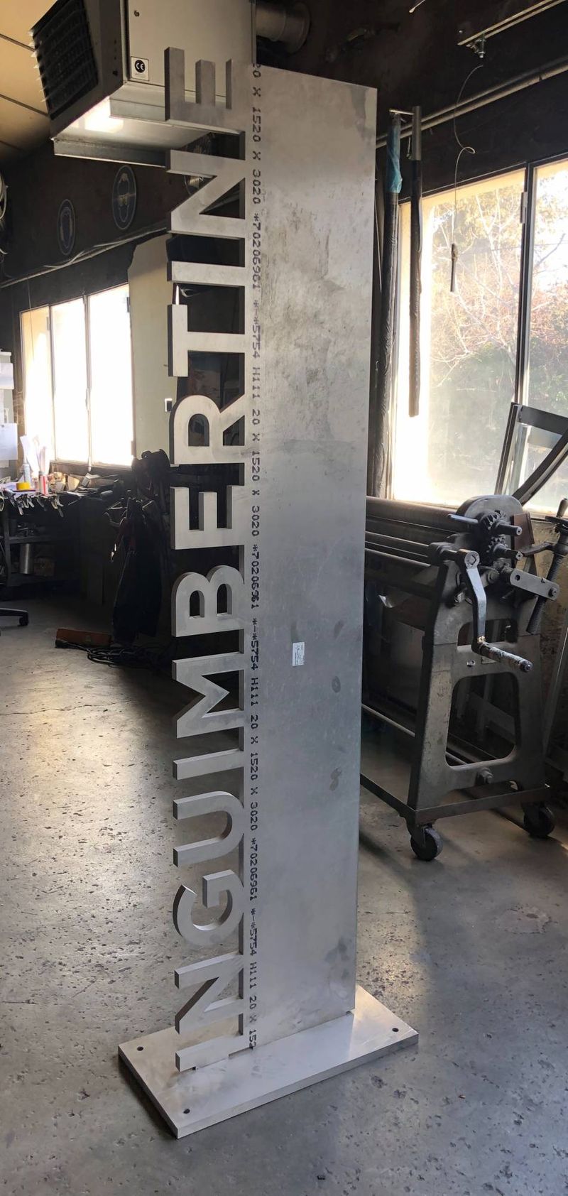 Le totem lui-même, ainsi que les lettres qui le composent, sont soigneusement découpés à plat dans le matériau, ajoutant un esthétique à l'ensemble. Cette signalétique constitue un rappel harmonieux des lettres boitier en aluminium, préalablement conçues pour ce même emplacement, établissant ainsi une continuité visuelle élégante et distinctive.