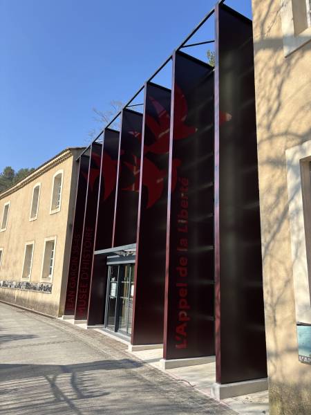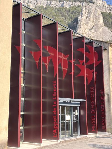 Ainsi pour le projet du département du Vaucluse, nous avons conçu des habillages pour les "Épines" de la façade du musée, nous avons placé des tôles en aluminium thermolaqué avec décor en film adhésif standard de couleur teinté dans la masse "Musée d'histoire Jean Garcin 39-45..." sur les "Épines" de la devanture du musée.