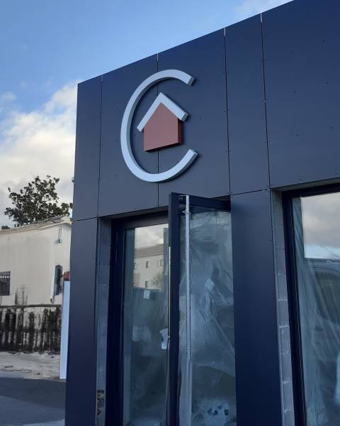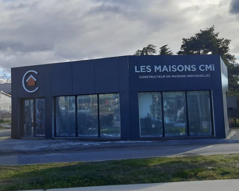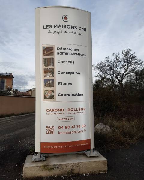 Les Maisons CMI ont fait appel à notre expertise pour la création de leur enseigne lettres boitier lumineuses plexiglas, d'un totem, et d'une vitrophanie.