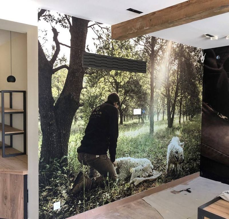Pour la boutique, nous avons réalisé une décoration murale à base de photos imprimées sur un vinyle adhésif spécial mur.