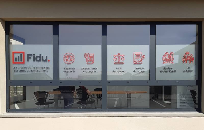 Dans le cadre de notre collaboration avec Fidu, nous avons suivi une charte bien définie pour la réalisation de vitrophanies et de plaques en plexiglas transparent. Les vitrophanies, fabriquées en adhésif dépoli, présentent des pictogrammes décrivant les activités et les services proposés, tout en offrant une certaine intimité aux bureaux. De même, un film adhésif dépoli a été appliqué dans la zone cuisine, garantissant une cohérence visuelle et fonctionnelle.