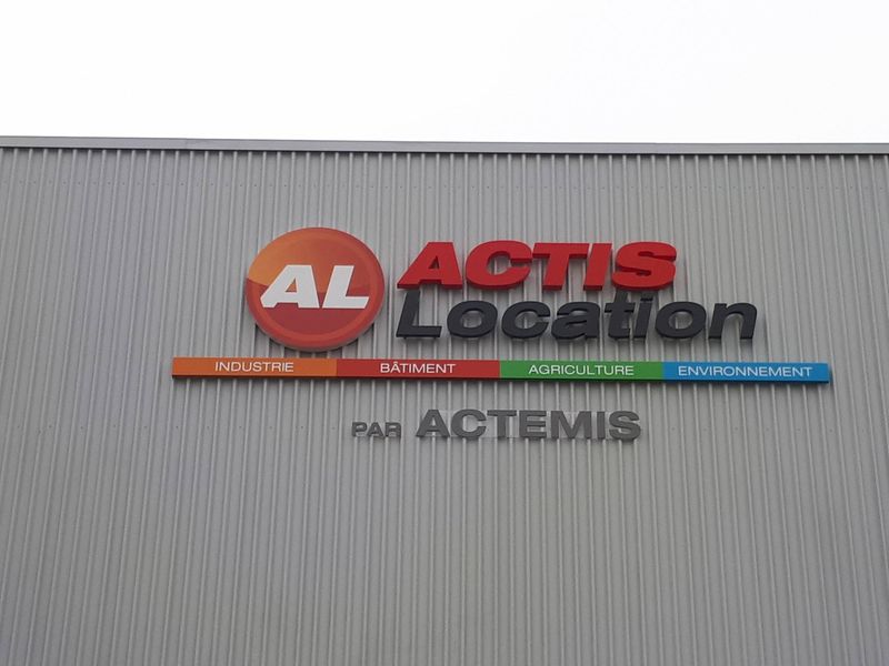 Le texte "ACTEMIS" se démarque avec des lettres boitier, où le "A" est lumineux grâce à du plexiglas, tandis que le reste du texte est en aluminium laqué, conférant une élégance moderne. Le logo "AL" présente une allure sophistiquée, réalisé en plexiglas diffusant avec un décor en impression numérique. Pour "ACTIS LOCATION", des lettres en relief en aluminium laqué ont été privilégiées, ajoutant une dimension tactile.
