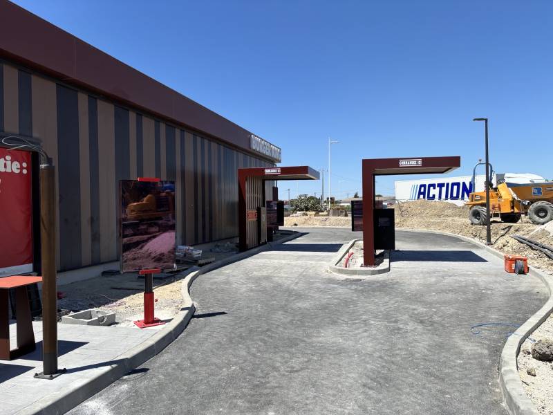 Notre équipe a posé plusieurs lettrages en film adhésif : " Grillé à la flamme depuis 1954 ", " Burger " et aussi des lettrages en film adhésif standard de couleur blanc : " Récupérez ici " + " Payez ici ", fixés sur l'auvent.