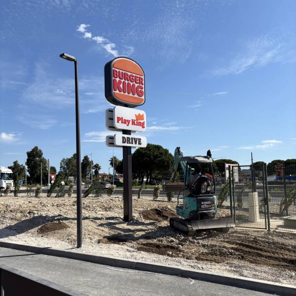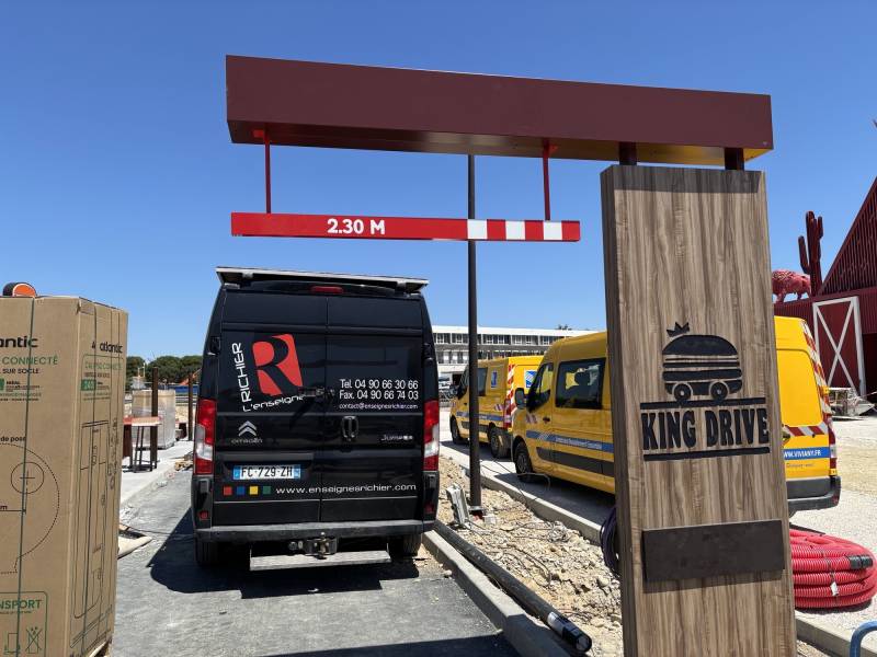 Notre équipe a fabriqué un totem sucette de 6.5 m avec une structure réalisée en tube acier de section avec deux logos " BURGER KING " recto-verso en thermoformé avec une structure périphérique en alu laqué et un éclairage intérieur par des diodes. Sur ce toem, on peut retrouver plusieurs caissons :