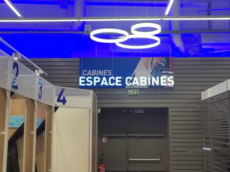 Côté intérieur, une enseigne lumineuse a été installée au niveau des cabines. Composée d'une semelle en PVC compact et d'une face en plexi blanc diffusant, avec un éclairage intérieur par des diodes blanches. La fixation se fait en suspente, sur plexiglas incolore, découpé à la forme des lettres.