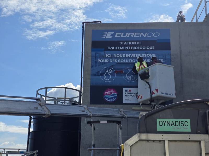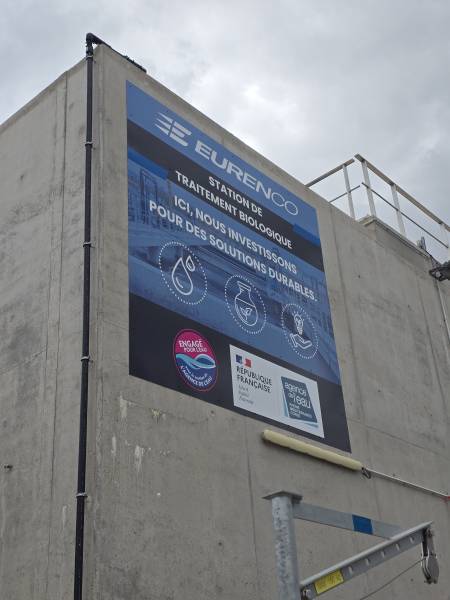 Pour répondre aux besoins d'Eurenco, nous avons fabriqué le panneau en alumatelbond, un matériau composite rigide, léger et parfaitement adapté à un usage extérieur. Le visuel a été appliqué sous forme de décor en impression numérique sur film adhésif, puis protégé par un pelliculage anti-UV afin de garantir sa durabilité face aux intempéries et aux expositions prolongées au soleil.