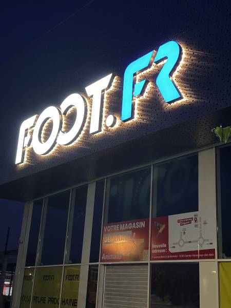 Ainsi, nous avons récemment conçu une enseigne lumineuse en lettres boîtiers pour Foot.FR, située à Sainte-Geneviève-des-Bois.