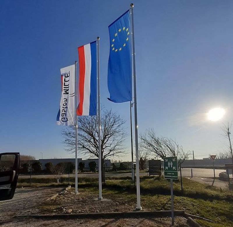 Installation et pose de mâts pour drapeaux. Les mâts ont été scellés par notre équipe de pose. Ces mâts sont en aluminium d’une hauteur de 8 mètres avec des drapeaux de 4 mètres.