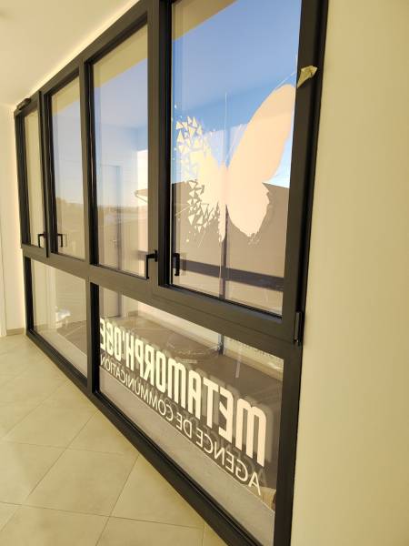 Nous avons également travaillé sur des adhésifs et vitrophanies pour diverses surfaces. Nous avons réalisé une vitrophanie de lettrage en film adhésif blanc appliqué en collage normal, affichant le logo et "Agence de communication 1er Étage" sur une porte du rez-de-chaussée. Sur une autre porte, le logo a été imprimé en numérique en lettrage film adhésif. Enfin, nous avons créé une vitrophanie comportant un lettrage en film adhésif blanc en collage inversé, accompagné d'un papillon en film adhésif par impression numérique.
