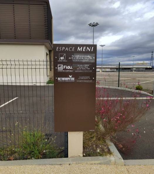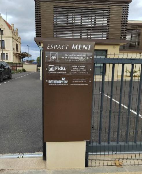 Pour ce projet, nous avons conçu des plaques signalétiques destinées à l’entrée de l’espace MENI. Ces plaques ont été fabriquées en plexiglas incolore, avec un lettrage en film adhésif par impression miroir de couleur blanc. Elles ont été fixées sur deux totems situés à l’entrée de l’espace MENI.