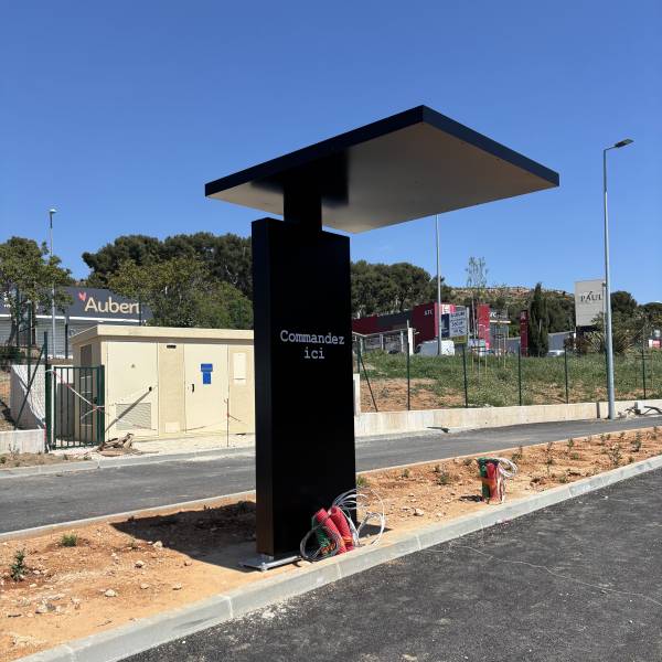 Nous avons également réalisé un auvent pour la borne de commande, que ça soit l'arche ou l'auvent, ils possèdent tout deux une structure en tube alu de section et un habillage de la structure par tôle en alu laqué. Sur l'arche, nous avons appliqué le lettrage "COMMANDEZ ICI" en film adhésif de couleur blanche.