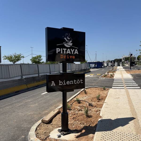 L’une met en valeur le lettrage "PITAYA", l’autre indique "ENTRÉE DRIVE" avec une flèche directionnelle. Ces éléments sont également éclairés par des diodes et fixés par des pièces en PVC laqué.