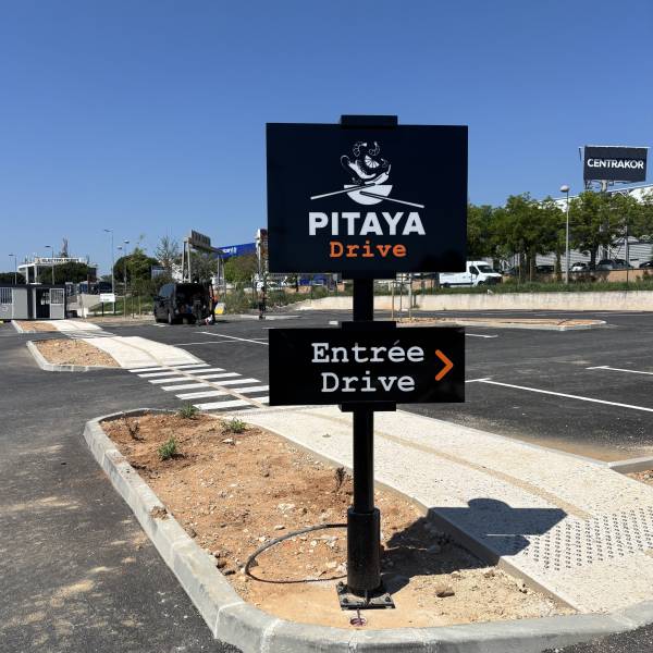 Nous avons également réalisé une signalétique double face pour l’entrée du drive, selon le même principe : un mât en aluminium laqué noir satiné, deux coques en plexiglas blanc diffusant et habillées d’un adhésif noir opaque.