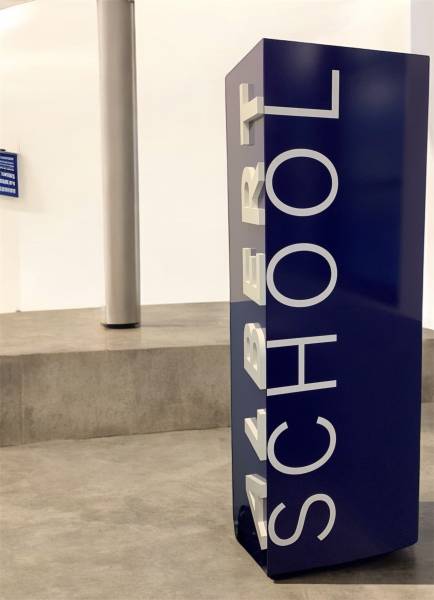 Afin de répondre à leur demande, nous avons conçu deux totems triangulaires de 2 mètres de haut, avec des faces en alu laqué. Pour le texte, nous avons réalisé "ALBERT" en PVC compact blanc, et "School" en adhésif longue durée blanc.